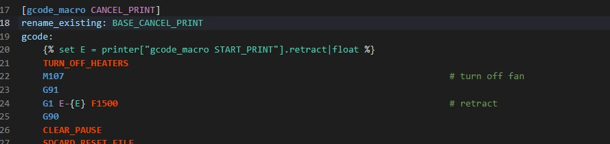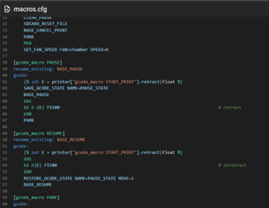Для работы макросов, код можно добавить в основной файл конфигурации, либо же можно создать файл macros.cfg и подключить его строкой [include macros.cfg] в основном файле конфигурации printer.cfg